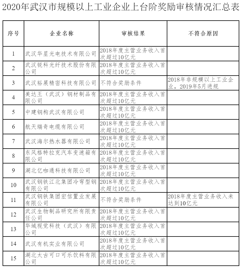 市經(jīng)信局關(guān)于2020年武漢市規(guī)模以上工業(yè)企業(yè)上臺(tái)階獎(jiǎng)勵(lì)項(xiàng)目審核情況的公示