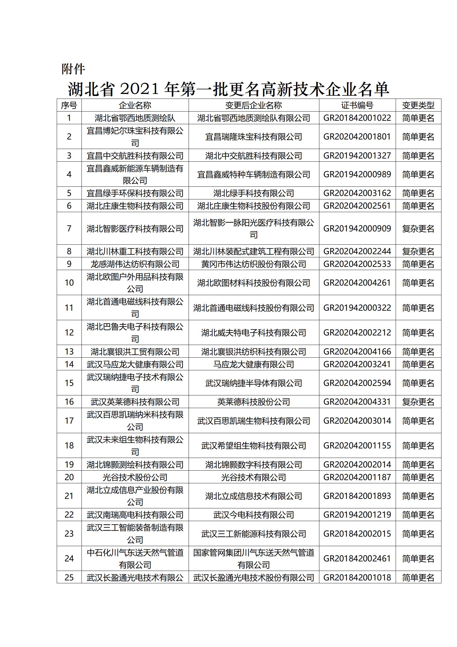 關(guān)于公布湖北省2021年第一批更名高新技術(shù)企業(yè)名單的通知