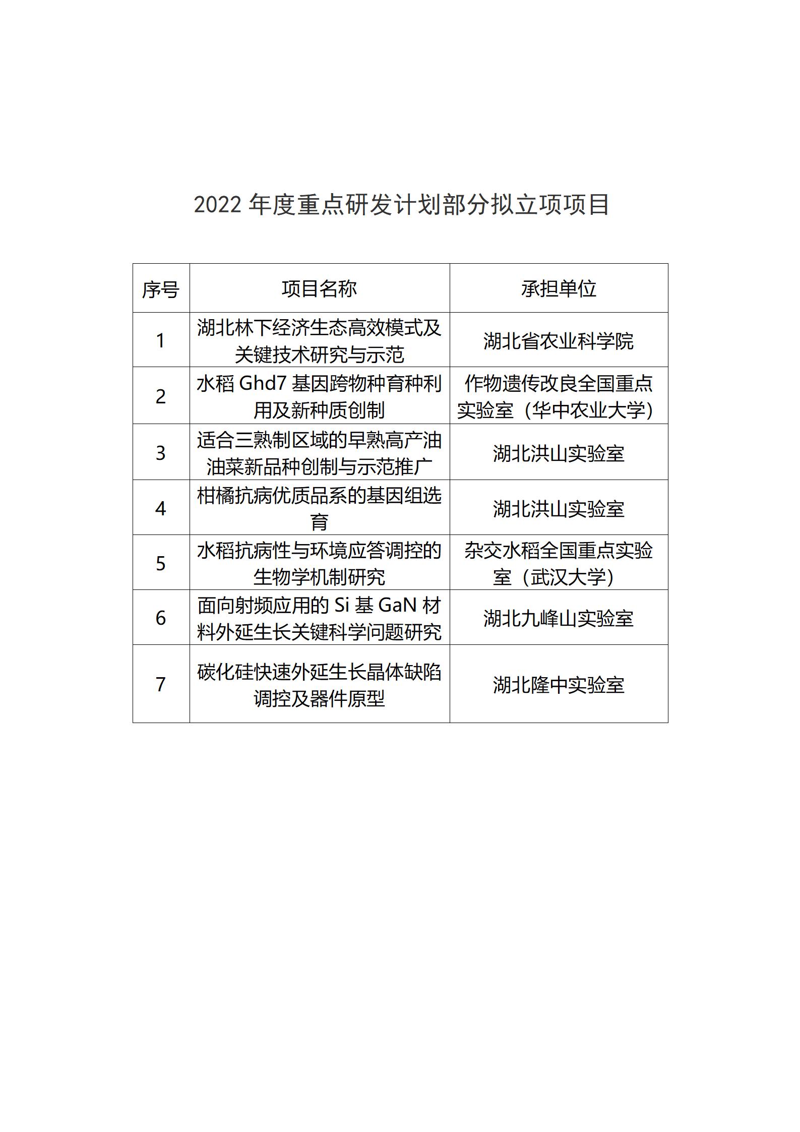 根據(jù)《中共中央辦公廳 國務(wù)院辦公廳關(guān)于深化項(xiàng)目評審、人才評價(jià)、機(jī)構(gòu)評估改革的意見》《湖北省科技計(jì)劃項(xiàng)目管理辦法》要求,現(xiàn)將2022年度重點(diǎn)研發(fā)計(jì)劃部分?jǐn)M立項(xiàng)項(xiàng)目予以公示。